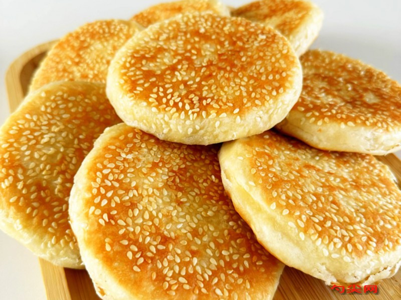 工艺:将面粉500克与泡多源A5克倒入和面盆,干拌1分钟至混合均匀,酵母4克、白糖10克加入温水300克中搅拌溶解,缓慢倒入面粉中,边倒边搅拌成面絮状,用手揉成光滑面团,覆盖保鲜膜,置于温暖处(温度30℃)醒发30分钟至体积膨胀1倍,将50克面粉放入碗中,加入50克热油、五香粉5克、盐3克,搅拌成无干粉的油酥,醒发好的面团揉压排气,擀成0.3厘米厚的长方形薄片,均匀涂抹油酥,从长边卷起成圆柱状,分割成60克/个的剂子,两端捏紧封口,立起后按扁,擀成直径10厘米的圆形饼胚,平底锅或电饼铛预热至160℃,放入饼胚,小火烙制2分钟至底面微黄,翻面继续烙制1.5分钟,两面均呈淡黄色且饼体膨松后取出。