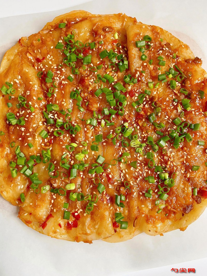 工艺:将面粉和面欣酥A干拌均匀。将温水倒入面粉中,边倒边搅拌,加入少许色拉油和成面团,揉至光滑后,表面刷油,密封醒面30分钟以上。醒面期间,制作酱料。锅中加入色拉油,油热后下入姜末和洋葱末炒香,加入甜面酱、郫县豆瓣酱、番茄沙司、耗油和白糖翻炒,加入清水熬制至稍微浓稠,再加入鸡精、味达蕾901号和孜然粉,翻拌均匀后出锅备用。将醒好的面团分成若干份,擀成圆形薄饼。预热电饼铛或平底锅,刷上一层薄薄的色拉油,将擀好的饼放入锅中,烙制定型后翻面,烙至两面金黄熟透。在烙好的饼上刷涂熬好的酱料,撒上葱花、熟芝麻等装饰物,切块后即可出售。