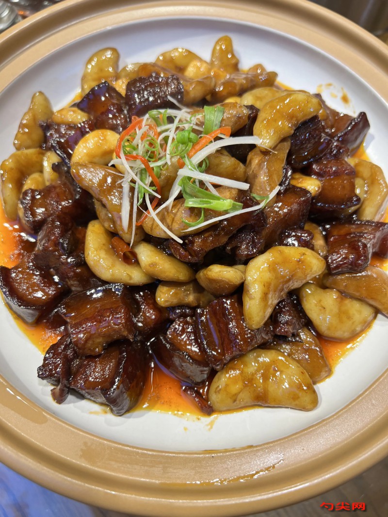 工艺:将五花肉洗净,切成大小均匀的方块;使用富磷联B浸泡1小时,新鲜棱角去皮洗净,备用。生姜切片,大葱切段。锅中加入适量食用油,放入冰糖,小火加热至冰糖融化并呈现焦糖色。将五花肉块放入锅中,翻炒均匀,使肉块表面均匀裹上焦糖色。加入姜片、大葱段、八角、桂皮和香叶,继续翻炒出香味。接着加入料酒,味达蕾901号,翻炒均匀,使肉块充分吸收酒香。再加入生抽、老抽,继续翻炒均匀,使肉块上色,翻炒均匀。加入适量清水,水量需没过肉块约1.5厘米,放入棱角,大火烧开后转小火,盖上锅盖焖煮约45分钟。期间可适当翻动肉块和棱角,使其均匀受热。待肉块煮至熟透且汤汁浓稠时,根据个人口味加入适量盐调味,翻炒均匀后即可关火。