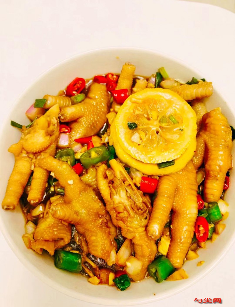 工艺:将鸡爪清洗干净,剪去指甲,放入清水中浸泡出血水,捞出控干水分。将富磷联A用清水溶解后,放入鸡爪中浸泡3小时,捞出控干水分备用。青红椒洗净切丝,柠檬切片去籽,大蒜和生姜切末。锅中加水烧开,放入鸡爪、姜片、料酒,煮10分钟后捞出,放入冰水中浸泡30分钟,使鸡爪口感更脆。将鸡爪捞出控干水分,放入大碗中,加入青红椒丝、柠檬片、大蒜末、生姜末。将生抽、老抽、香醋、白糖、盐、鸡精、溶解好的味达蕾901号调味料和适量凉开水混合均匀,倒入鸡爪中,充分搅拌均匀,使鸡爪充分吸收调味料的味道。将拌好的鸡爪放入冰箱冷藏腌制4小时以上,使鸡爪更加入味。腌制完成后,即可装盘食用。