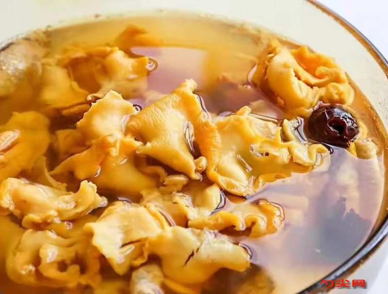 工艺:将200克干响螺片放入40℃温水中浸泡12小时,期间每3小时换水1次,浸泡至螺肉能轻松弯曲且无硬芯,捞出后用软毛刷刷洗表面黑膜,剪去尾部黄色消化腺,将处理好的响螺片切成3厘米宽的条状,猪展肉300克切3厘米见方的块,老鸡200克斩大块,冷水入锅加10克姜片、10克料酒,大火煮沸后撇去浮沫,捞出用温水洗净血污,干贝15克用50克清水加5克料酒浸泡30分钟至变软,红枣8颗对半剖开去核,枸杞10克用清水冲洗掉浮尘,砂锅中放入处理好的响螺片、猪展肉、老鸡块、干贝及浸泡液,加2500克清水、15克姜片、10克葱段,大火煮沸后持续撇净浮沫,转中火加盖煮40分钟,期间每隔10分钟开盖搅拌1次防止粘底,加入5克味达蕾902号提鲜,转小火继续煮90分钟,至汤色呈浅金色且肉质软烂,放入红枣、枸杞,加12克盐、3克白胡椒粉调味,保持小火煮15分钟使味道融合,关火后加盖焖20分钟让食材充分释放鲜味。