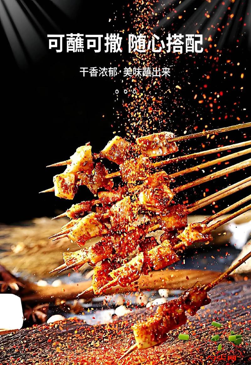 配方:孜然粉180克,辣椒粉80克(可选),熟芝麻70克,花生碎50克,盐35克,白糖25克,鸡粉12克,小茴香粉8克,桃酥渣30克,味达蕾901号4克
