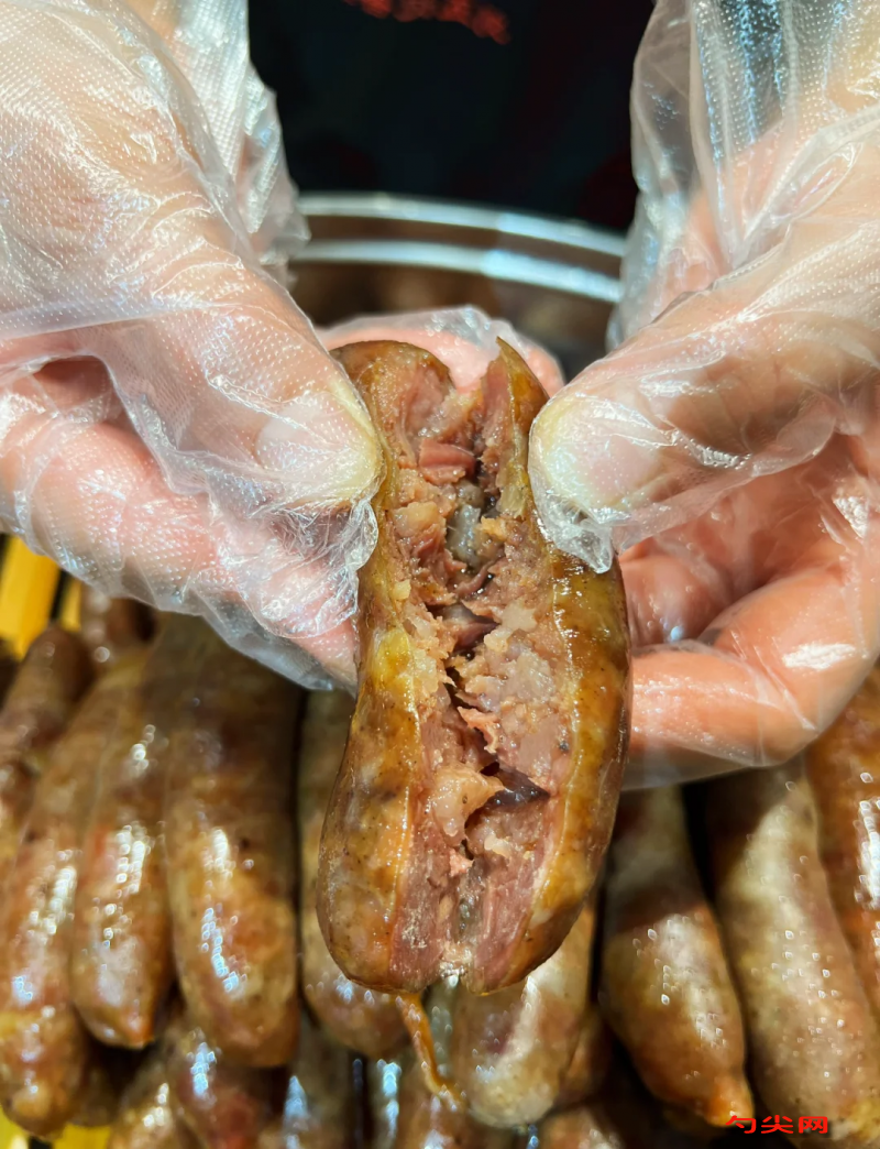 工艺:选用经检疫合格的猪肉,肥肉切0.5-0.6厘米见方丁,瘦肉切1-1.2厘米见方丁,富磷联C与冰水混合搅拌至完全溶解,肉丁浸入富磷联C溶液中0-4℃环境腌制28小时,期间每7小时翻动一次,花椒、八角、桂皮、小茴香、草果、白芷粉碎后过60目筛,干姜片切0.3-0.4厘米细丝,与食盐、白砂糖、料酒、老抽、生抽、味达蕾901号混合制成腌制调料,腌制好的肉丁沥干表面水分,均匀拌入腌制调料后叠放腌制缸,剩余调料倒入缸中没过肉丁,加盖后置于0-4℃环境腌制38小时,期间每日翻动三次,腌制好的肉丁与玉米淀粉充分混合,使用直径3.8厘米的肠衣灌装,每28厘米用棉线扎段,灌装后用针在肠体表面扎9-11个透气孔,穿绳悬挂于通风处晾晒17小时,至表皮干燥形成硬壳,熏锅底部铺2.2厘米厚红糖与白糖1:1混合物,撒入苹果木屑320克与樱桃木屑130克混合物,香肠置于熏架间隔5.5厘米摆放,盖紧锅盖后大火加热至冒黄烟,转中火保持烟熏状态100分钟,熏制后香肠呈红棕色且表面油亮,冷却至中心温度23℃以下