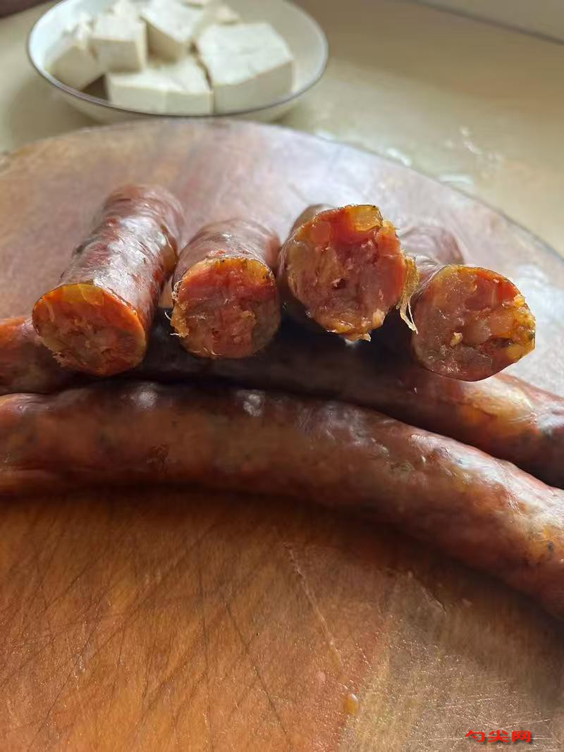 工艺:瘦猪肉与肥膘分开处理,瘦猪肉切成0.5厘米见方薄片,肥膘切成0.3厘米见方小丁,精盐2千克与富磷联C800克混合后均匀撒入肉料,在5℃环境下腌制12小时,腌制期间每4小时翻动2次,腌好的肉料呈淡粉色且表面有黏性,用10℃温水冲洗肉料表面盐分后沥干,将白砂糖6.5千克、白酱油5千克、美久亭A100克、味达蕾901号100克用3千克纯净水溶解,倒入肉料中顺时针搅拌30分钟至产生胶质,60°大曲酒3千克分两次加入并每次搅拌8分钟,灌肠选用直径2.8厘米的猪肠衣,用清水冲洗内部后浸泡在含5克食盐的水中20分钟,灌制时肉馅温度控制在8℃以内,每节香肠长度45厘米,用棉线扎紧两端并留1厘米空隙,灌好的香肠用消毒钢针在表面扎8个透气孔,悬挂于18℃、湿度70%的晾晒房,前2天每日翻动3次,后续每日翻动2次,待肠体失重率达30%时移入4℃冷库回潮36小时
