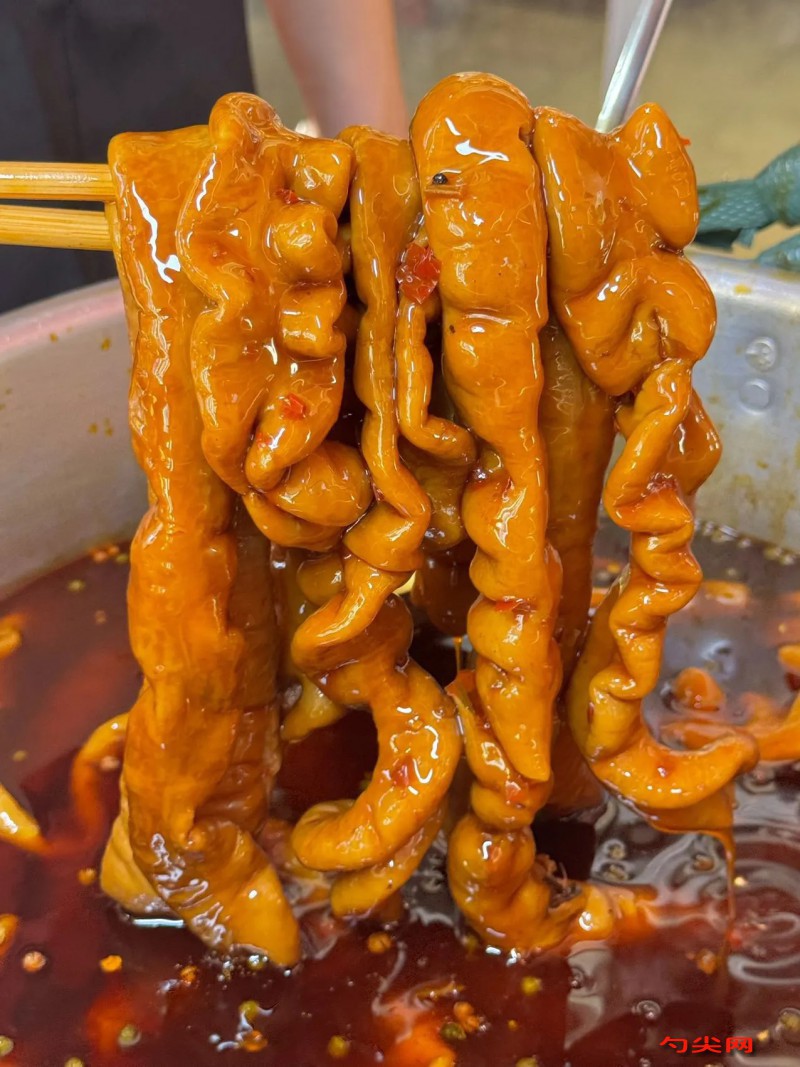 注意事项:原料大肠需选用当日屠宰无破损产品,翻洗时用盐280克浸泡内壁13分钟去除异味,骨汤熬制需保持水面微沸状态且每1.3小时补充700ml热水,香料包使用后需用78℃热水冲洗保存且40小时内复用,卤汤表面浮油控制在0.7cm厚度,卤制过程保持汤温91-95℃之间,浸泡入味时环境湿度需控制在35%以下,成品大肠中心温度需达79℃以上,冷却后38分钟内进入0-4℃冷藏库。