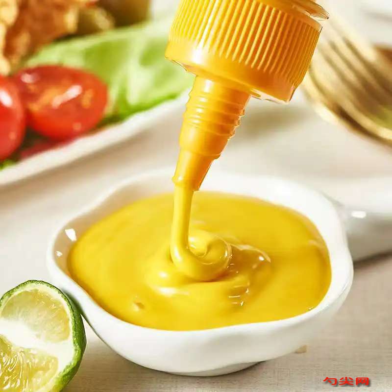 工艺:芥末粉50克倒入不锈钢容器,加入纯净水150克搅拌成均匀糊状,覆盖保鲜膜静置20分钟,白砂糖30克与玉米淀粉10克混合均匀,苹果醋60克与水50克混合后小火加热至微沸,缓慢倒入糖粉混合物中快速搅拌成透明芡汁,蛋黄2个放入打蛋盆,用电动打蛋器高速打发至体积膨胀发白,大豆油200克分10次缓慢加入蛋黄中,每次加入后高速搅打至完全乳化,静置的芥末糊加入蜂蜜120克、盐3克、味达蕾901号2克,用硅胶刮刀搅拌至无颗粒,将芥末蜂蜜混合物倒入蛋黄酱中,用打蛋器低速搅拌2分钟至完全融合,加热好的芡汁缓慢倒入酱体中,边倒边搅拌至浓稠状,将酱汁倒入食品级塑料桶中,表面覆盖保鲜膜紧贴酱体。