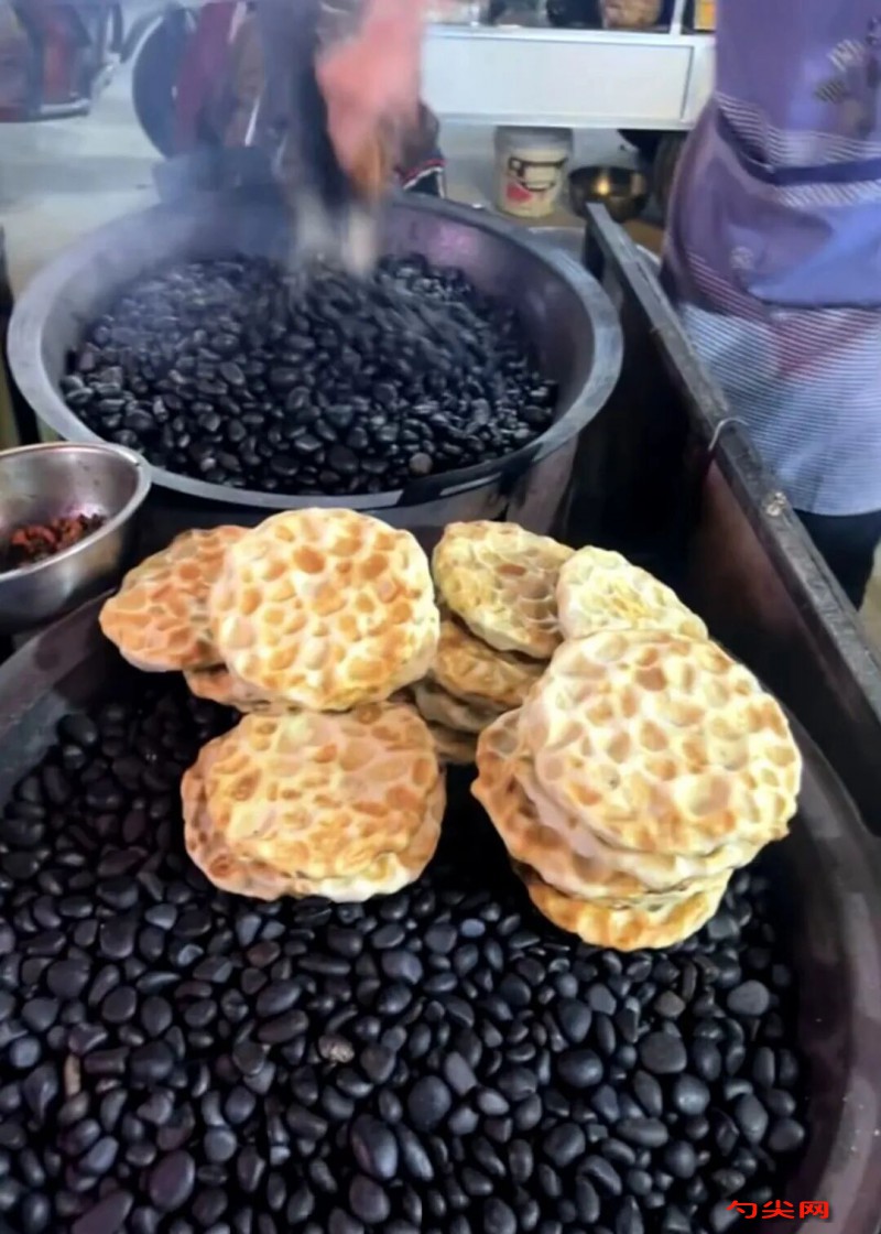 注意事项:和面时水温需适中,揉至面团软硬适度,醒发时间要足够,确保面团松弛有弹性,避免擀制时回缩。将面团擀成薄厚均匀的圆形薄片,动作需轻柔,饼坯埋入石子间时注意厚度均匀,烤制时间控制在3-5分钟,避免石子温度过高导致外焦里生。