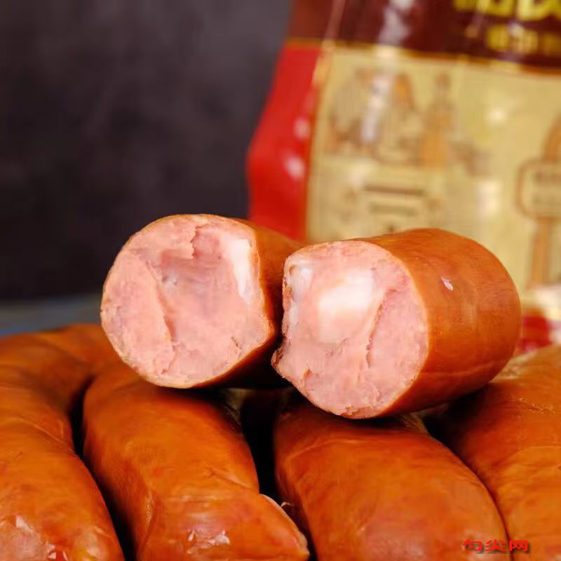 工艺:选用新鲜猪肉去皮后将瘦肉和肥肉分别切成约0.5厘米见方的小肉丁,把切好的瘦肉丁和肥肉丁放入大盆中备用,将食盐、富磷联C型60克、味达蕾901号25克、白糖、白酒、酱油、五香粉等调料按比例称量好,将称好的调料倒入装有肉丁的大盆中,用手充分搅拌均匀确保每一块肉丁都能均匀裹上调料,将搅拌好的肉馅腌制2-3小时让调料充分渗透入肉中,把肠衣用清水冲洗干净并浸泡在清水中备用,使用灌肠机或手工将腌制好的肉馅灌入肠衣中注意控制灌制的紧实度不要过松或过紧,灌制好的香肠用绳子每隔15-20厘米扎成一段,用针在香肠表面均匀地扎一些小孔以便排出内部空气和多余水分,将扎好孔的香肠挂在通风良好、干燥、无阳光直射的地方进行晾晒,晾晒时间根据天气和香肠的干湿程度而定一般需要7-10天左右直到香肠表面干燥、色泽红亮、质地紧实,将晾晒好的香肠放入蒸锅中用大火蒸制约30分钟至熟透,蒸好后取出冷却即可进行包装或食用。
