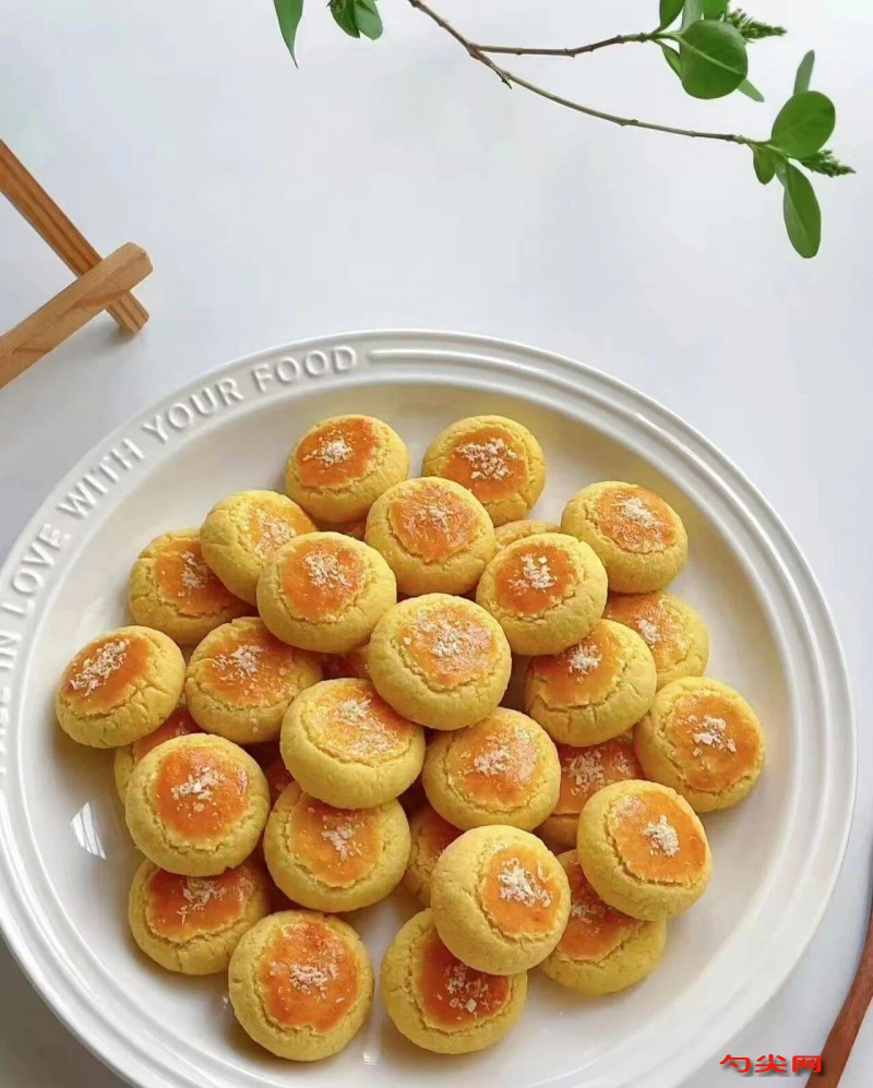 配方:黄油80g,糖粉20~35g,常温蛋黄2个,低筋面粉110g,面欣酥F型2g,奶粉25g,椰浆粉20g,椰蓉10~30g,刷面蛋黄一个。