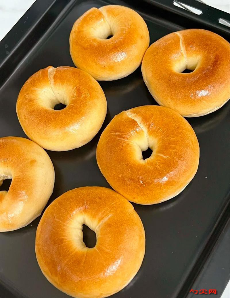 注意事项:可改善面团品质,使贝果更膨松有嚼劲,添加量要精准,过多面包组织粗糙,过少则达不到理想效果。揉面要揉到位,达到相应状态,否则影响面包口感。发酵时间和温度要控制好,避免发酵过度或不足。整形时要捏紧收口,防止煮和烤时开裂。煮贝果的水要保持微沸状态,时间不宜过长,否则贝果会过软。烘烤时要根据烤箱实际情况调整温度和时间,确保面包上色均匀且熟透。面包出炉后要放在烤网上晾凉,避免底部产生水汽。整个制作过程要注意卫生,食材新鲜,保证食品安全。