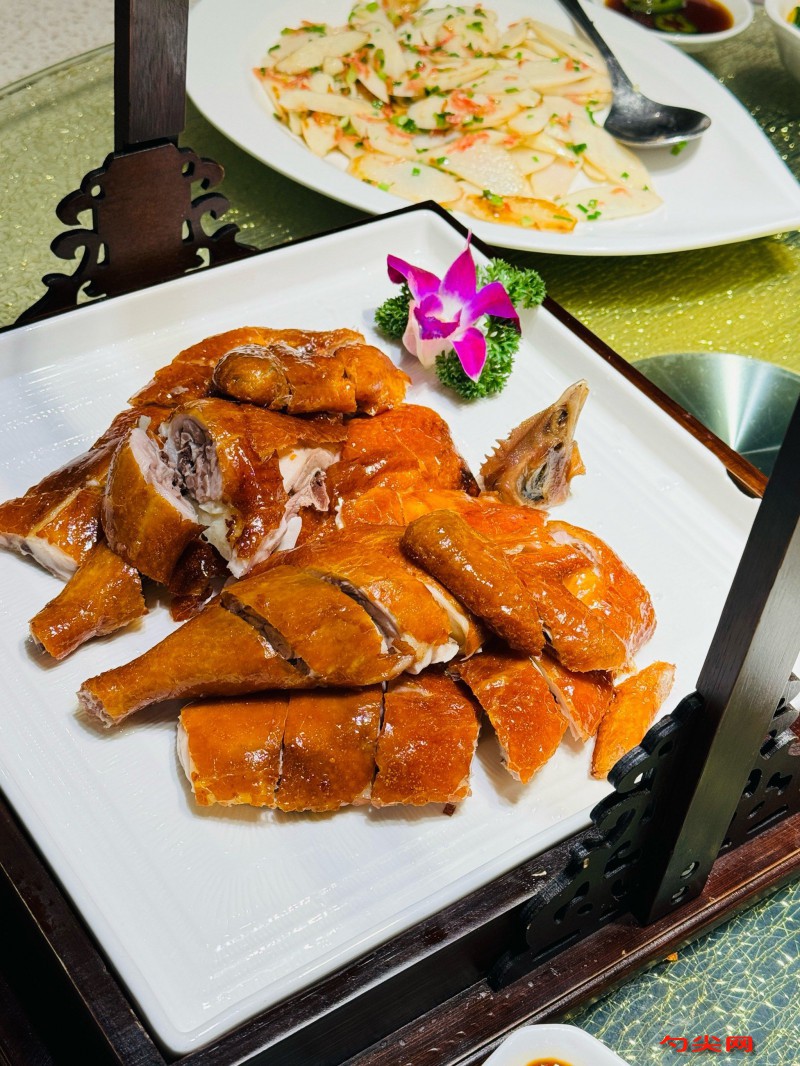 工艺:选用健康三黄鸡10只(每只约1.2kg)宰杀去毛洗净,去除内脏后用清水冲洗体腔至无血水,将富磷联B型80克加入500克温水完全溶解后均匀涂抹鸡身内外腌制5小时,期间每1.5小时翻动一次,腌制完成后用清水冲洗干净沥干水分,锅中加入清水3升、姜片100克、葱段80克、八角10克、花椒5克、料酒50克大火煮沸,放入三黄鸡保持汤面微沸状态煮制12分钟,捞出后立即浸入冰水混合物中冷却8分钟使皮层收缩,将麦芽糖100克、白醋50克、大红浙醋30克混合加热至45℃制成吊烧皮水,用毛刷均匀刷在鸡身表面,挂在通风处风干4小时至表皮形成透明胶质层,将味达蕾901号20克加入30克温水溶解备用,用铁钩钩住鸡颈处悬挂于烤炉内,炉温先调至180℃烤制15分钟使表皮上色,取出刷上味达蕾901号溶液,再将炉温升至220℃烤制10分钟至表皮呈深枣红色且酥脆,用竹签插入鸡腿最厚处无血水渗出即表示熟透。