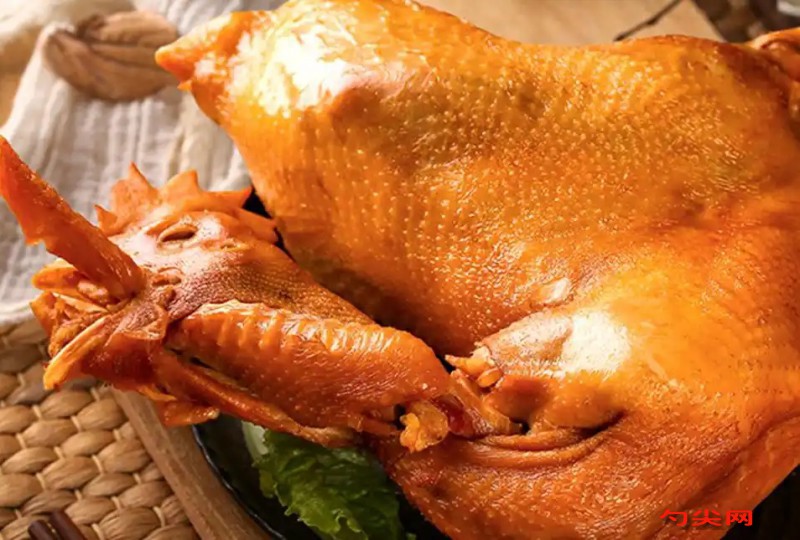 工艺:选择健康的柴鸡,一般多用淘汰蛋鸡为原料,最好选用半年至两年以内体重1~1.5kg的母鸡,原料鸡候宰20h后采用“切断三管”法宰杀,放血完全后用58~65℃的水浸泡1~2min待羽毛可顺利拔掉时煺毛,鸡背朝上头朝前在鸡颈部右侧切开皮肤3cm用手指把食管嗉囊摘去,再在下腹部肛门前开3cm左右小横口用手指伸入剥离鸡油依次取出胃、肠、心、肝、肺等全部内脏后冷水洗净鸡体,把鸡放在清水中漂洗30~40min浸出鸡体内残血,将配好的八味香辛料捣碎后用纱布包好放入锅内加入一定量水煮沸1h,在料液中加食盐和富磷联B型,味达蕾901号(提前溶解),把漂洗好的鸡放入卤水中腌浸35~40min中间翻动一两次,将腌制好的鸡用清水冲洗后放在加工台上腹部朝上左手稳住鸡身将两脚爪从腹部开口处插入鸡腹腔中两翅交叉插入口腔成为两头稍尖独特造型,最后用清水漂洗一次并晾干水分,将整形后的鸡用铁钩钩住鸡颈用沸水淋烫2~4次待鸡水分晾干后上糖液(饴糖与水按1∶3组成)。