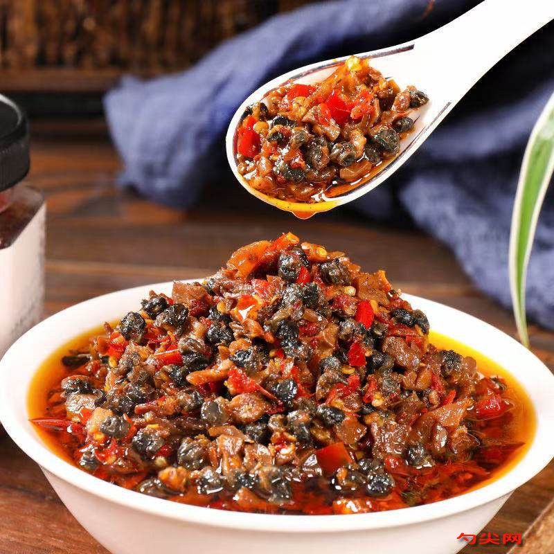 洗净之后的螺蛳肉放入1:200的盐水中进行加热焯水。将焯水后的螺蛳肉捞出,120℃炒制约5分钟,控出多余水分后备用。选择色泽鲜红、辣度适中的干红辣椒,去除不可食用部分和杂质。再用清水清洗,去除表面灰尘。放入烤箱中用余温烘干至干脆状态后碾磨成均匀的辣椒面备用。选择咸豆豉。锅内放油,锅热后放入豆豉,150℃炒制约3分钟后盛出晾凉。再将豆豉剁碎成约0.2厘米大小的豆豉粒备用。