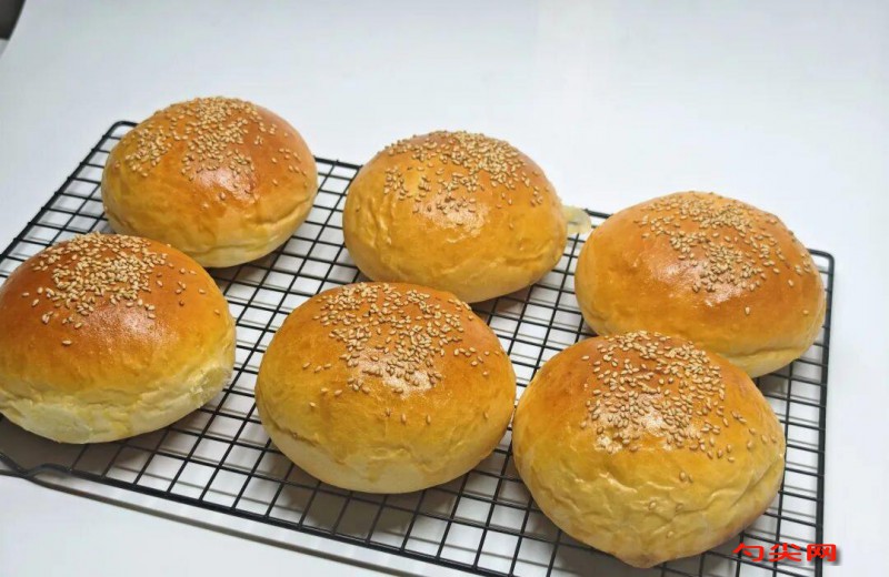 工艺:1、先来做烫种,将高筋面粉25克,白砂糖3克和盐0.3克混合均匀,倒入沸水28克,搅拌至无干粉,包上保鲜膜,放入冰箱冷藏备用2、面包桶里放入高筋面粉210克,低筋面粉40克,耐高糖酵母3克,盐2克,白砂糖35克,奶粉10克,全蛋液25克,佳多美Q型4克,美久亭Q型0.3克,淡奶油30克,牛奶150克,烫种所有3、揉面至能扯出粗膜4、放入软化黄油30克5、继续揉面至能拉出薄膜即可6、将面团醒发60分钟或者2倍大7、手指蘸粉戳孔不回弹不塌陷8、在案板上撒上干粉防粘,把发好的面团放到案板上,不用揉面,按压排气,平均分成6分,每份100克左右9、将小剂子按压排气,翻面,往中间收拢,收口捏紧,滚圆,放入铺好烘焙纸的烤盘10、将烤箱设置发酵模式,发酵温度30度二次发酵40分钟11、取出,预热烤箱12、在表面刷一层蛋液13、撒上白芝麻适量14、上火150度,下火180度15、烘烤25~28分钟16、出炉17、放晾网上晾会儿。