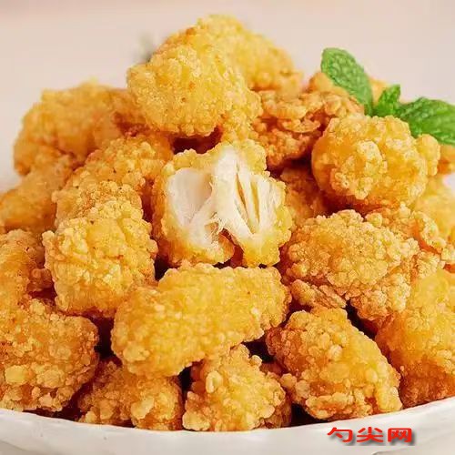 工艺:鸡胸肉切块,加入富磷联B型、泡多源E型、香草碎、姜末、葱末、盐、味达蕾901号,抓拌均匀后冷藏腌制2小时。低筋面粉、玉米淀粉、面欣酥F型混合均匀。腌制好的鸡肉先裹一层裹粉,过清水后重复裹粉,抖出鳞片状。油温160度下入鸡肉,小火炸至金黄酥脆(约4-5分钟),捞出控油。