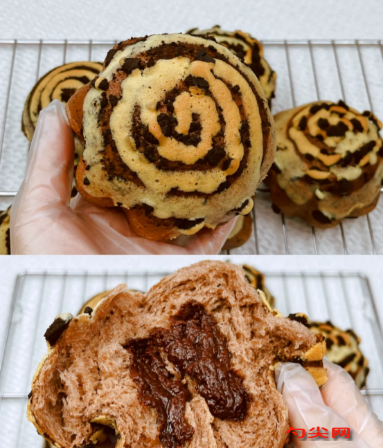 工艺:高筋粉、可可粉、佳多美Q型,奶粉、糖、酵母搅撒加入水、鸡蛋液先低速搅拌无干粉转快速搅打至锯齿膜加软化黄油、美久亭Q型(提前溶解),盐低速搅拌黄油吸收转快速搅打至手套膜,巧克力、淡奶油隔热水融化搅拌均匀,盖保鲜膜冷藏凝固一发28度湿度76%发酵60分钟左右,均匀分成6个面团盖保鲜膜松弛15分钟,松弛好的面团撒少量干粉,轻拍面团排气、翻面放上巧克力馅捏紧收口,刷蛋液蘸奥利奥碎放入模具。墨西哥酱黄油、糖粉搅拌均匀少量多次加蛋液搅拌融合,筛入低筋粉搅拌均匀,发酵好的面包挤上墨西哥酱。风炉模式155度,烘烤20分钟,出炉冷却!