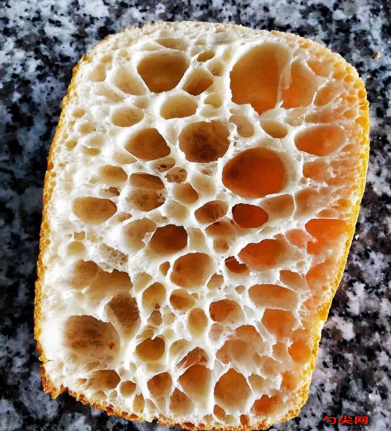 2️【选择更纯粹的配方】配方设计是影响面包组织结构和口感的关键因素。高水量面团更容易形成大气孔,而大气孔是胶质感的重要载体。面团含水量需达85%-90%或者更多,甚至100%。高水量促进淀粉糊化,形成胶质感,并为气孔膨胀提供空间。同时,要避免高油脂,高蛋白的材料,油脂(譬如:黄油、蛋黄等)会填充面筋间隙,使组织变得细腻但缺乏胶质感。所以常见的大气孔多为无糖无油,或是夏巴塔这种含水量高,仅添加橄榄油的欧包。