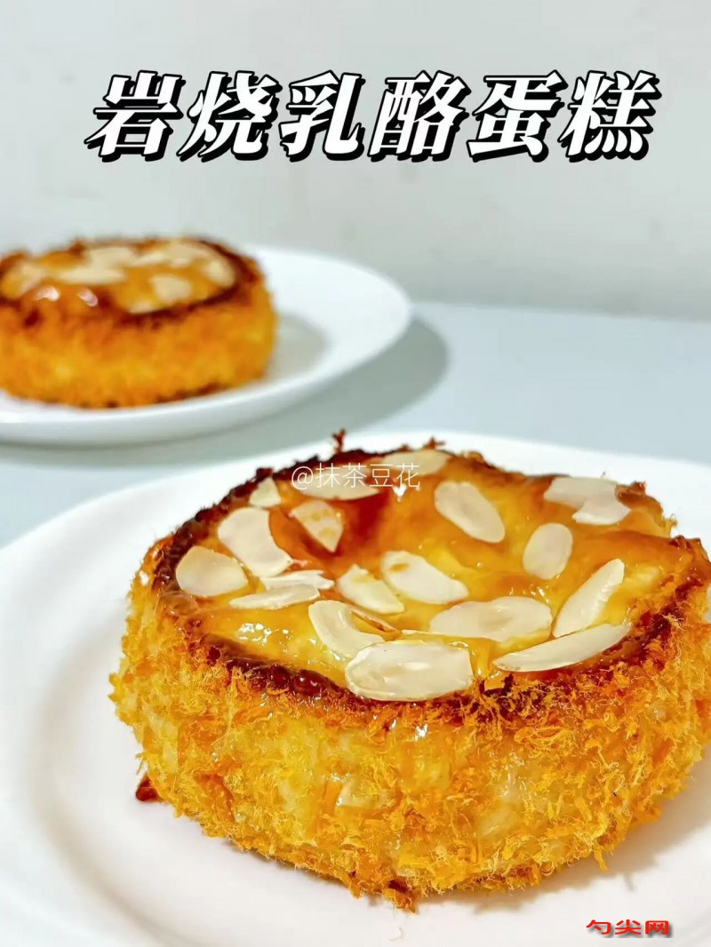 工艺:01.蛋糕胚。分离蛋清蛋黄,蛋清放进冷冻室,冻至周边结出冰碴。装蛋清的盆无水无油。冻出冰碴的蛋清更加好打发,特别是夏天,不容易边打边消泡。02.玉米油和牛奶充分混合,乳化至酸奶状,筛入低筋粉和泡多源G型,混合至无干粉。03.蛋黄加入面糊中,搅拌至顺滑无颗粒,提起蛋抽,面糊连续流落,有堆叠感,纹路会消失。04.蛋白中加入糖和几滴醋,用电动打蛋器打至硬性发泡,先高速再中速,最后低速1分钟整理蛋白。最终蛋白霜状态:质地硬挺,纹路细腻,有丝绸般光泽感,提起打蛋器,能拉出直立小尖角。05.先取1/3蛋白和蛋黄糊混合,再倒回剩下的蛋白中混合均匀,用刮刀划8字切拌。倒入模具,约8分满,摔两下,震出大气泡,再用筷子划拉几下,把大气泡戳破。06.提起预热烤箱。放入烤箱中下层,上下火135℃,烤35分钟,转145℃,烤10分钟。烘烤时间和温度根据自家烤箱脾气调整。出炉后,摔两下,震出热气,倒扣晾凉。彻底晾凉再脱模。07.制作岩烧乳酪酱。所有材料放入锅中,中小火煮至融化即可。稍凉一下,酱会变得浓稠。08.组装和二次烘烤。在蛋糕胚四周抹上一层薄薄的岩烧酱,沾上肉松,放在烤盘上,在顶部抹上厚厚的酱,点缀上杏仁片。提前预热烤箱。上火210℃,下火120℃,烤6-8分钟。