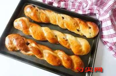 工艺流程:面皮:将鹏泰一号粉、新西兰奶粉、佳多美Q型、盐、一级砂糖、干酵母、水、美久亭Q型(提前溶解),鸡蛋、炼乳和烤焙奶油混合,揉成光滑的面团。面团进行包油操作,四折两次,然后冷冻松弛约30分钟。将松弛好的面团开皮,尺寸调整为去掉两头后的1.8451.8厘米。将面团正向上劲,左手为中心点按平,右手围绕中心点圈起,封口收到面包底部,然后冷冻储存。从冷冻中取出面团,冷藏解冻。成型时,在酸奶提子中心部位放置杏仁片,然后套上酸奶提子模具。在温度32℃、湿度85%的环境下醒发90分钟。醒发好的面团常温凉制5分钟。烤前在上面放两张烤盘。烤制温度为185℃,烘烤时间为14分钟。面包凉冷后,从侧面锯开。挤入酸奶馅并抹平。放上朗姆提子干作为表面装饰。撒上空心十字糖粉。