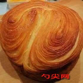 工艺流程:面皮:将鹏泰一号粉、奶粉、佳多美Q型、盐、一级砂糖、燕子干酵母、水、美久亭Q型(提前溶解),鸡蛋、炼乳和烤焙奶油混合,揉成光滑的面团。面团进行包油操作,四折两次,然后冷冻松弛约30分钟。开皮,尺寸处理,冷冻密封储存。从冷冻中取出面团,冷藏解冻。整形,下面粘少许面粉,放入烤盘,准备醒发。在温度32℃、湿度85%的环境下醒发90分钟。醒发好的面团常温凉制5分钟。中间留有6厘米的空间,对折面团,对折处上侧留有0.1厘米的缝隙。将面团放入1号耐烤纸托中。准备蛋液(全蛋液或蛋黄液),搅拌均匀并过滤,刷在面团表面。烤制温度为上火185℃、下火200℃,烘烤时间为17分钟。