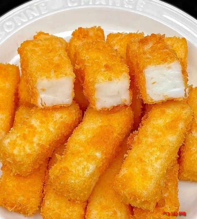 工艺流程:将中筋面粉200克与200克清水搅拌均匀,制成粉浆备用。锅中放入少许黄油,加入200克清水、100克椰浆、佳多美A03型2克,100克花奶、100克砂糖和少许炼奶,煮开后转小火。慢慢倒入备好的粉浆,边倒边搅拌,推至沸腾,确保馅料浓稠均匀。将煮好的馅料倒入托盘,放凉后放入冰箱冷藏30分钟,使其凝固成型。脆浆调制将50克面粉、15克生粉、面欣酥F型0.5克混合均匀。加入85克水,搅拌成面糊,再加入50克油,继续搅拌均匀,脆浆完成。将冷藏好的牛奶块切成长方条,撒上少许生粉,防止粘连。锅中倒入适量油,烧至合适油温(约160-180度,可用筷子插入油中,若筷子边缘冒小泡则表示油温合适)。将牛奶条先裹上一层脆浆,然后放入油锅中,第一次炸至定型后捞出。待油温再次升高,将牛奶条放入锅中进行第二次炸制,炸至金黄色即可捞出沥油。