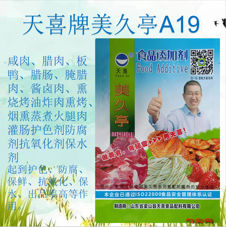 ★商品名:天喜牌美久亭A19型 产品名称:美久亭牌复配抗氧化护色剂3 型号:MJT-A19本品按照《食品安全国家标准 食品添加剂使用标准GB2760》及补充规定的品种、应用分类、使用范围、最大使用量、残留量等科学组方,并且按照《食品安全国家标准 复配食品添加剂通则GB26687》精心配制而成。本品已经通过食品生产许可,保障食品安全。用户按照本说明的用法用量生产制作的腌腊肉制品类(如咸肉、腊肉、板鸭、中式火腿、腊肠)(食品分类号:08.02.02)、酱卤肉制品类(食品分类号:08.03.01)、熏、烧、烤肉类(食品分类号:08.03.02)、油炸肉类(食品分类号:08.03.03)、西式 火腿 (熏烤、烟熏、蒸煮火腿)类(食品分类号:08.03.04)、肉灌肠类(食品分类号:08.03.05)、发酵肉制品类(食品分类号:08.03.06)、肉罐头类(食品分类号:08.03.08)既不会超标也不会超量。