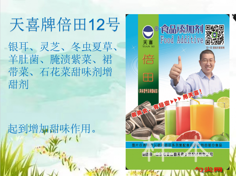 ★商品名:天喜牌倍田12型 产品名称:倍田牌复配甜味剂12 型号:BT-12 本品按照《食品安全国家标准 食品添加剂使用标准GB2760》及补充规定的品种、应用分类、使用范围、最大使用量、残留量等科学组方,并且按照《食品安全国家标准 复配食品添加剂通则GB26687》精心配制而成。本品已经通过食品生产许可,保障食品安全。用户按照本说明的用法用量生产制作的糖果(食品分类号:05.02 )既不会超标也不会超量。