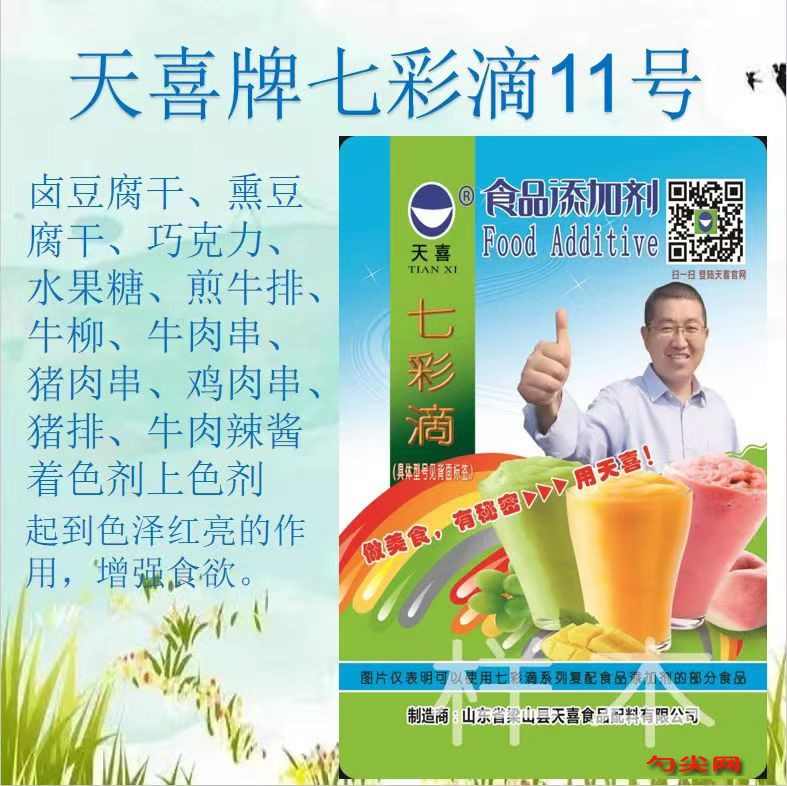 ★商品名:天喜牌七彩滴11号 产品名称:七彩滴牌复配着色剂7 型号:QCD-11 本品按照《食品安全国家标准 食品添加剂使用标准GB2760》及补充规定的品种、应用分类、使用范围、最大使用量、残留量等科学组方,并且按照《食品安全国家标准 复配食品添加剂通则GB26687》精心配制而成。本品已经通过食品生产许可,保障食品安全。用户按照本说明的用法用量生产制作的豆干再制品(食品分类号:04.04.01.03)、可可制品、巧克力和巧克力制品, 包括代可可脂巧克力及制品(食品分类号:05.01)、糖果(食品分类号:05.02)、面糊(如用于鱼和禽肉的拖面糊)、裹粉、煎炸粉(食品分类号:06.03.02.04)、调理肉制品(生肉添加调理料) (食品分类号:08.02.01)、酱及酱制品(食品分类号:12.05)、复合调味料(食品分类号:12.10)既不会超标也不会超量。