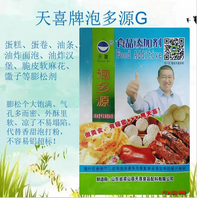 (八).油炸馓子做法:配方:面粉500克、泡多源G型10克、植物油1.5公斤,盐7-10克,凉水250克。工艺:(1) 用盐、泡多源G型加200克水合面拌匀后,反复揉搓,随揉随加余下的水直至面团细密无粒。放入盆中,盖上湿面稍醒片刻。将醒好的面压成扁状厚1.5厘米,再切为1.5厘米长条,揉成与筷子大小后,将其放在抹好的油的盆中,每一盘一层刷一引进油以防粘连,待全部盘完后,用布盖上醒50~60分钟。(2) 将植物油烧热,将盘好的条取出,条头放在左手食指根处用拇指压住,由里向外绕在其它4个手指上,随绕随将条拉细。约绕30圈左右,将条揪断。断头压在圈内,再用两手食指伸入圈内拉长2/3,再用两根筷子代替两个食指把两条绷直,下入油内炸至半熟时斜折过来,定型后抽出筷子,作至深黄时捞出即成。特色:色黄,酥脆味香可口。