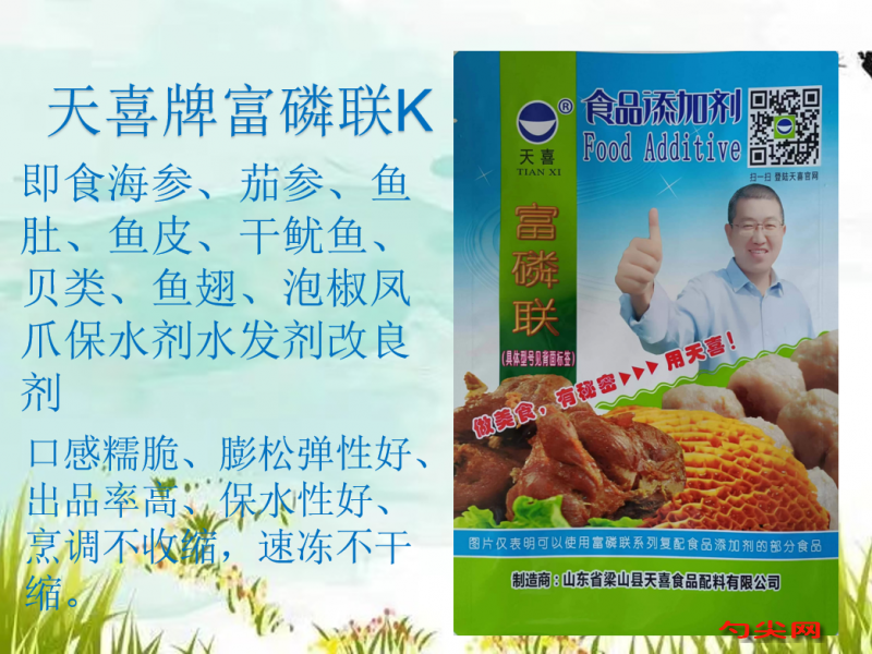 ★功能作用:采用〔富磷联K型〕加工制作的即食海参、茄参、鱼肚、鱼皮、水发干鱿鱼、水发干贝类、水发干鱼翅、泡椒凤爪等冷冻水产品、熟制水产品、预制肉制品、熟肉制品口感糯脆、膨松弹性好、出品率高、保水性好、烹调不收缩,速冻不干缩。油炸鱼类制品膨松饱满。发制水产品,〔富磷联K型〕替代火碱使用,安全合法!