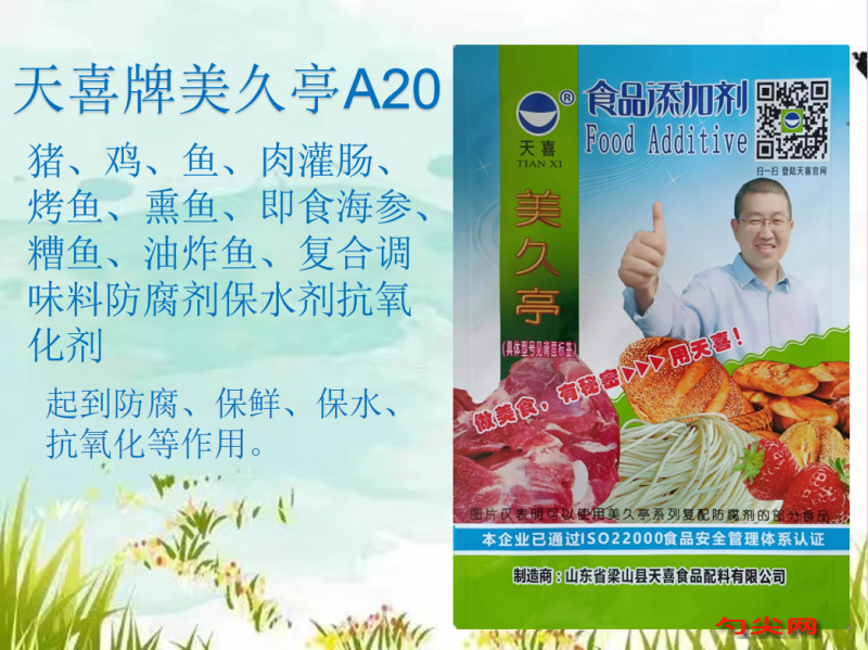 ★功能作用:〔美久亭A20型〕用于猪肉灌肠、鸡肉灌肠、鱼肉灌肠、烤鱼、熏鱼、即食海参、糟鱼、油炸鱼、虾酱、熟海蜇、炸鱼皮、烤鱼片、烤虾等肉灌肠类、熟制水产品、复合调味料,起到防腐、保鲜、保水、抗氧化等作用。对于烤、炸鱼类虾类,还有肉质细嫩、口感酥脆的作用。