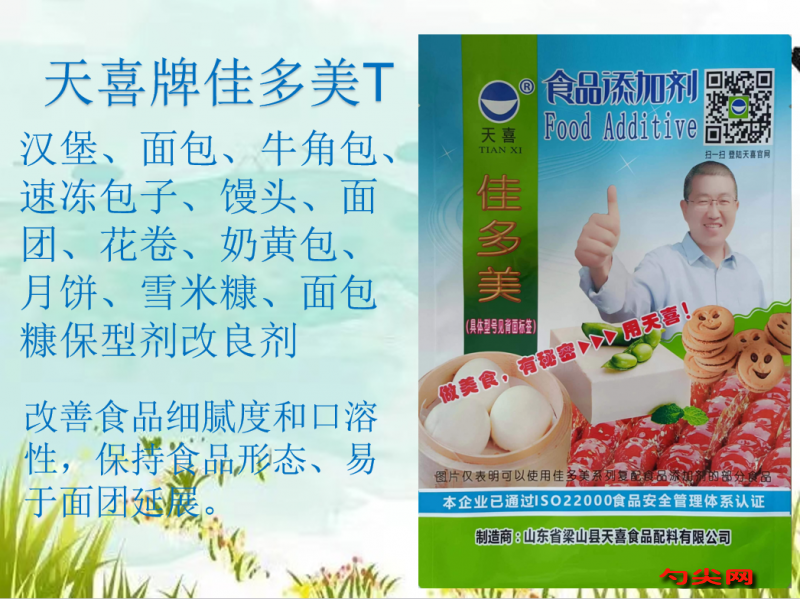 ★功能作用:〔佳多美T型〕用于油炸汉堡、面包、牛角包、速冻包子、馒头、面团、花卷、奶黄包、月饼、雪米糠、面包糠、辣条等食品,可以起到乳化、膨松、抗氧化等作用,改善食品细腻度和口溶性,保持食品形态、易于面团延展。〔佳多美T型〕与佳多美K效果略有不同,〔佳多美T型〕相对乳化性更好一些,对于降解面粉筋度更强一些。