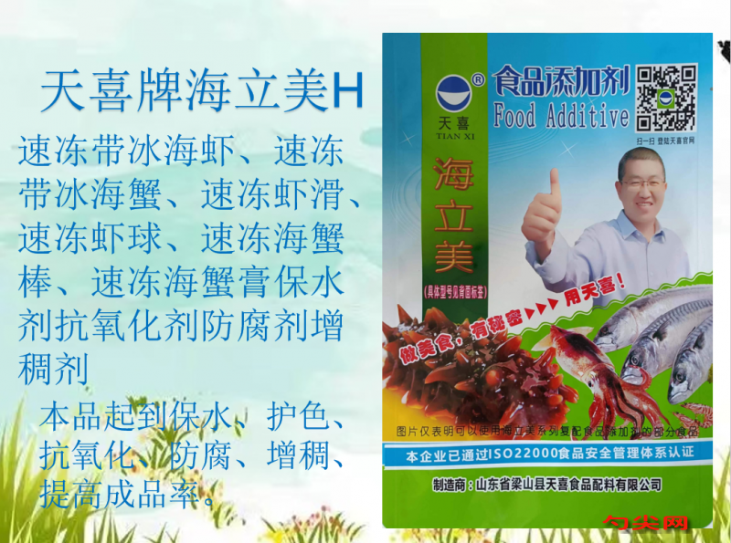 ★功能作用:〔海立美H型〕用于速冻带冰海虾、速冻带冰海蟹、速冻虾滑、速冻虾球、速冻海蟹棒、速冻海蟹膏等海水虾蟹类及其制品,起到保水、护色、抗氧化、防腐、增稠、提高成品率。