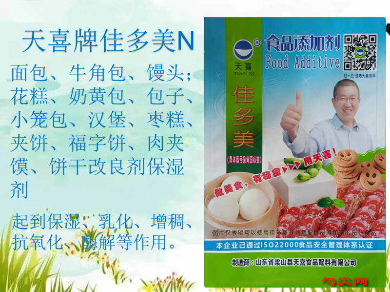 ★功能作用:〔佳多美N型〕用于面包、牛角包、馒头;花糕、奶黄包、包子、小笼包、汉堡、枣糕、夹饼、福字饼、肉夹馍、饼干等发酵面制品、糕点、面包、饼干,起到保湿、乳化、增稠、抗氧化、酶解等作用。
