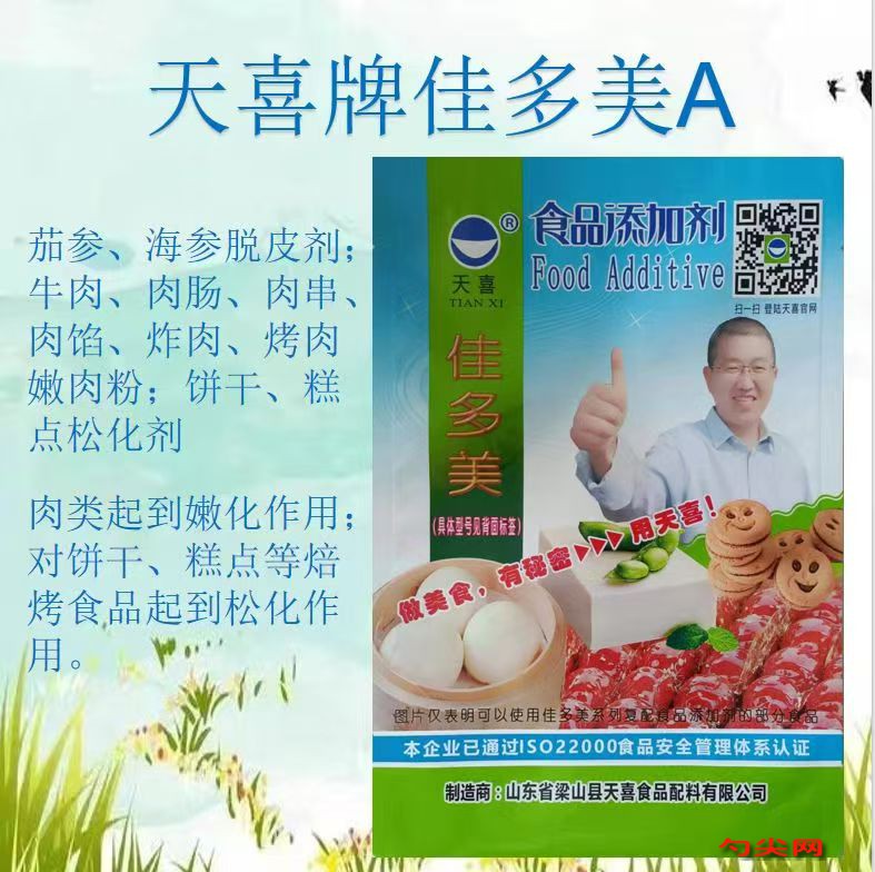 ★商品名:天喜牌佳多美A型 产品名称:佳多美牌复配酶制剂 型号:JDM-A 本品按照《食品安全国家标准 食品添加剂使用标准GB2760》及补充规定的品种、应用分类、使用范围、最大使用量、残留量等科学组方,并且按照《食品安全国家标准 复配食品添加剂通则GB26687》精心配制而成。本品已经通过食品生产许可,保障食品安全。用户按照本说明的用法用量生产制作的 各类食品(配料表中成分在GB2760表A.1中有限量要求的食品除外;配料表中成分在GB2760表A.3中所例外的食品除外)既不会超标也不会超量。★配料表:木瓜蛋白酶、谷氨酰胺转氨酶、食用玉米淀粉。
