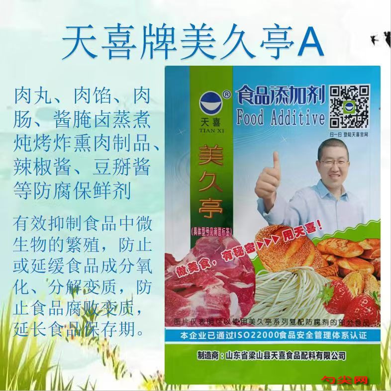 功能作用:〔美久亭A型〕用于 肉丸、肉肠、酱腌卤蒸煮炖烤炸熏肉制品等熟制肉制品,以及辣椒酱、沙拉酱、蛋黄酱、咖喱膏、牛肉酱、猪肉酱、番茄沙司、西瓜酱、豆掰酱等固体调味料、半固体调味料、液体调味料、复合调味料,可以调节食品PH值,有效抑制食品中微生物的繁殖,防止或延缓食品成分氧化、分解变质,防止食品腐败变质,延长食品保存期,起到防腐保鲜作用。〔美久亭A型〕还可用于肉粉肠、卤猪蹄、无磷卤鸡爪、油炸萝卜肉丸子、香菇牛肉酱、无磷小酥肉、猪皮冻、油炸大酥肉、四喜丸子、豆渣鸡肉酱、豆渣猪肉酱、炖猪蹄、猪肉肠、蒸水晶猪皮冻、卤猪皮卷、番茄酱、腐竹腐皮肉卷、腊肉肠、脆皮肠、玉米脆皮肠、坛子鸡、荷叶叫花鸡、香草竹笼鸡、卤鸭舌、五香烧鸡、麻辣鸭翅、卤鸭锁骨、卤羊蹄、酱卤鸭翅根、肉粉肠、卤猪脸肉、五香卤鸭腿、麻辣鸭肠、五香酱肘子、速冻猪肉小酥肉、速冻鸡肉小酥肉、卤鸭掌、卤鸭胗、卤猪舌、卤猪尾巴、卤猪心、烤猪脆骨、蔬菜皮冻肠、盐水鸭、卤猪头、卤酱香猪耳朵、水晶肴肉、水晶猪头肉焖子、油皮卷煎、熏肉卷、松花鸡腿、麻辣鸭头、黄豆猪蹄、炸鸡架、油炸鸡叉骨、卤猪耳、柠檬无骨鸡爪、猪肝炖煮、卤鸽子、油炸鸽子、卤猪肘、卤鸭脖、泡椒猪皮、泡椒凤爪、卤鸡爪、猪肉脯、牛肉香辣酱、雪花重组肉、雪花鸡排、烤鸽子、水发卤制鸡胗、水发猪大肠、红烧驴肉、青辣椒酱、油炸鸡排、五香酱卤牛肉、香辣肉酱、牛肉丸、羊肉丸、猪肉丸、鸡肉丸、猪排重组肉、鸡肉玉米香肠、猪肉香肠、烤鸭、烤肠、烧鸡、粉肚、红烧狮子头、鱼肉丸、速冻虾丸、鸡肉肠、猪肉肠、哈尔滨红肠、脱骨烧鸡、酱牛肉、卤新鲜牛肚、卤牛蹄等熟肉制品、复合调味料,起到防腐保鲜作用。