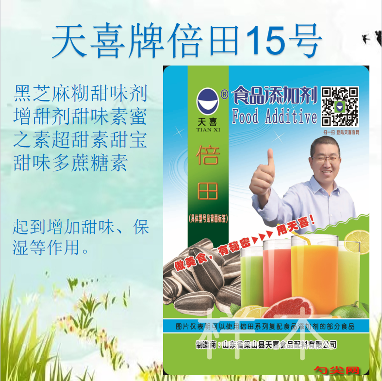 ★商品名:天喜牌倍田15型 产品名称:倍田牌复配甜味剂15 型号:BT-15 本品按照《食品安全国家标准 食品添加剂使用标准GB2760》及补充规定的品种、应用分类、使用范围、最大使用量、残留量等科学组方,并且按照《食品安全国家标准 复配食品添加剂通则GB26687》精心配制而成。本品已经通过食品生产许可,保障食品安全。用户按照本说明的用法用量生产制作的其他杂粮制品(仅限黑芝麻糊)(食品分类号:06.04.02.02)既不会超标也不会超量。