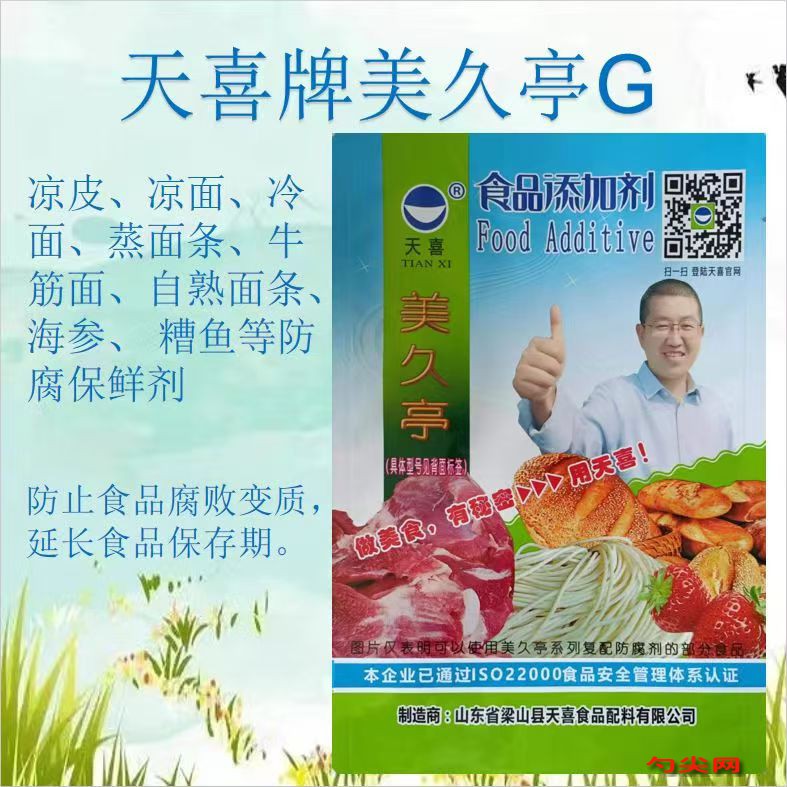 ★功能作用:〔美久亭G〕用于凉皮、酿皮、凉面、冷面、炒面条、蒸面条、牛筋面、自熟面条、热干面、玉米肠、素肠、面筋肠、糯米肠、即食海参、炖鱼、糟鱼、炸鱼、烤鱿鱼、熏鱼、熟鱼干、熟鱼罐头、预制肉制品、熟制肉制品等方便湿面制品、肉类制品、熟制水产品、米面杂粮灌肠制品,可以有效抑制食品中微生物的繁殖,防止或延缓食品成分氧化、分解变质,防止食品腐败变质,延长食品保存期,起到防腐保鲜作用。乳酸链球菌素为生物防腐剂,食品更加安全健康。〔美久亭G〕还可用于免洗凉皮、无矾果蔬凉虾、果蔬凉皮、辣条、糟鱼、免洗果蔬凉皮、春饼、牛筋面、烤冷面、凉皮卷馍、海参等,起到防腐保鲜作用。