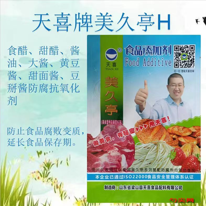 ★商品名:天喜牌美久亭H 产品名称:美久亭牌复配防腐剂5 型号:MJT-H 本品按照《食品安全国家标准 食品添加剂使用标准GB2760》及补充规定的品种、应用分类、使用范围、最大使用量、残留量等科学组方,并且按照《食品安全国家标准 复配食品添加剂通则GB26687》精心配制而成。本品已经通过食品生产许可,保障食品安全。用户按照本说明的用法用量生产制作的 食醋(食品分类号:12.03)、酱油(食品分类号:12.04)、酿造酱(食品分类号:12.05)既不会超标也不会超量。