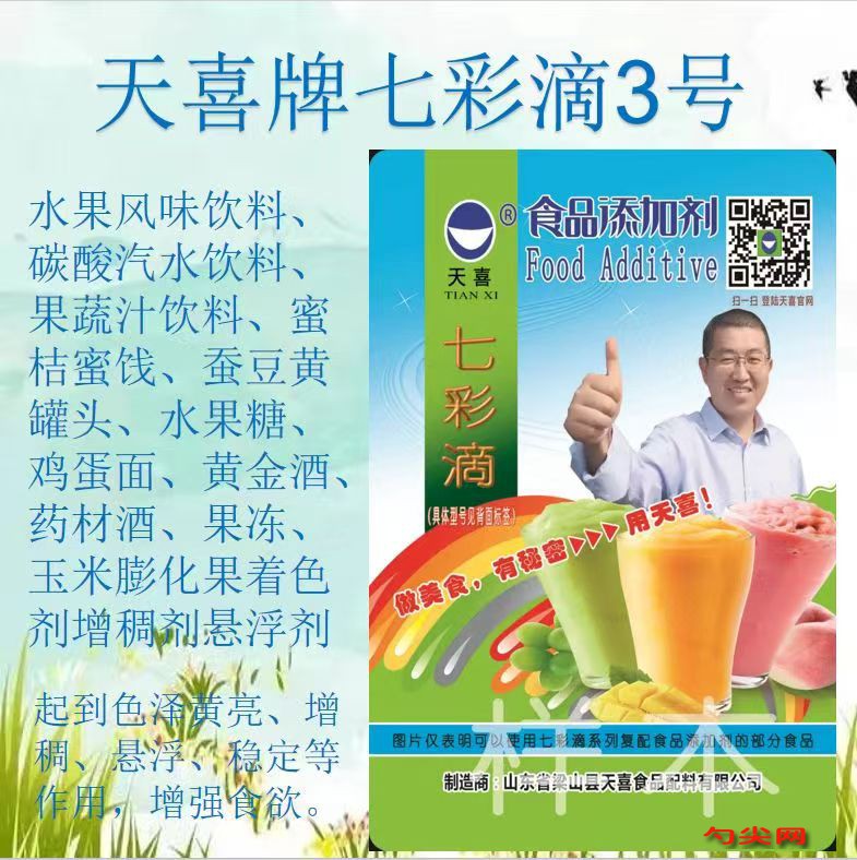 ★功能作用:〔七彩滴3型〕用于水果风味饮料、碳酸汽水饮料、果蔬汁饮料、蜜桔蜜饯、蚕豆黄罐头、水果糖、鸡蛋面、黄金酒、药材酒、果冻、玉米膨化果、甘草金桔等冷冻饮品(03.04食用冰除外)、蜜饯类、坚果与籽类罐头、可可制品、巧克力和巧克力制品(包括 代 可 可 脂 巧 克 力 及 制 品) 以及糖果、果蔬汁(浆)类饮料、生干面制品、风味饮料(仅限果味饮料)、配制酒、果冻、、大米小小酥(膨化食品)、膨化食品等,起到色泽黄亮、增稠、悬浮、稳定等作用,增强食欲。〔七彩滴3型〕使用色素为天然提取物,放心使用。〔七彩滴3型〕还可用于高粱饴软糖、水果软糖等。
