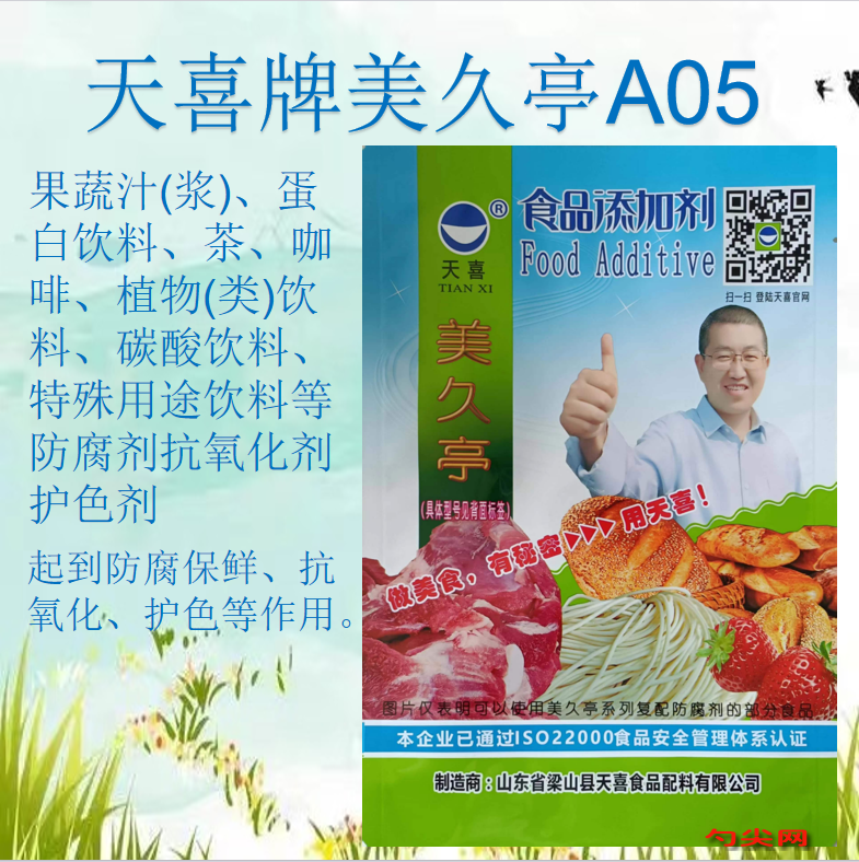 ★商品名:天喜牌美久亭A05型 产品名称:美久亭牌复配防腐剂20 型号:MJT-A05 本品按照《食品安全国家标准 食品添加剂使用标准GB2760》及补充规定的品种、应用分类、使用范围、最大使用量、残留量等科学组方,并且按照《食品安全国家标准 复配食品添加剂通则GB26687》精心配制而成。本品已经通过食品生产许可,保障食品安全。用户按照本说明的用法用量生产制作的浓缩果蔬汁(浆)(仅限食品工业用)(食品分类号:14.02.02)、果蔬汁(浆)类饮料(食品分类号:14.02.03)、蛋白饮料(食品分类号:14.03)、碳酸饮料(食品分类号:14.04)、茶、咖啡、植物(类)饮料(食品分类号:14.05)、特殊用途饮料(食品分类号:14.07)、风味饮料(食品分类号:14.08)既不会超标也不会超量。