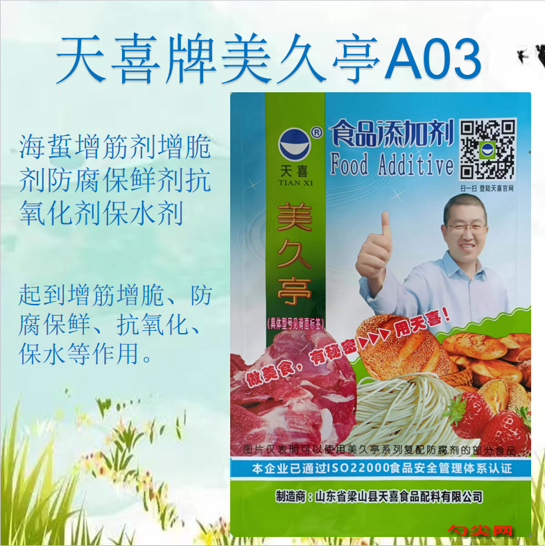 ★商品名:天喜牌美久亭A03型 产品名称:美久亭牌复配稳定防腐剂 型号:MJT-A03 本品按照《食品安全国家标准 食品添加剂使用标准GB2760》及补充规定的品种、应用分类、使用范围、最大使用量、残留量等科学组方,并且按照《食品安全国家标准 复配食品添加剂通则GB26687》精心配制而成。本品已经通过食品生产许可,保障食品安全。用户按照本说明的用法用量生产制作的腌制水产品(仅限海蜇) (09.03.02)既不会超标也不会超量。