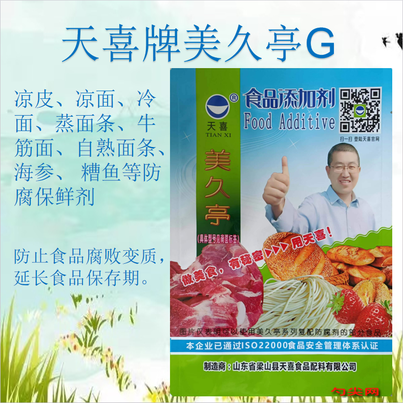 ★商品名:天喜牌美久亭G 产品名称:美久亭牌复配防腐剂7 型号:MJT-G 本品按照《食品安全国家标准 食品添加剂使用标准GB2760》及补充规定的品种、应用分类、使用范围、最大使用量、残留量等科学组方,并且按照《食品安全国家标准 复配食品添加剂通则GB26687》精心配制而成。本品已经通过食品生产许可,保障食品安全。用户按照本说明的用法用量生产制作的其他杂粮制品(仅限杂粮灌肠制品) (食品分类号:06.04.02.02)、方便米面制品(仅限方便湿面制品、米面灌肠制品)(食品分类号:06.07)、预制肉制品(食品分类号:08.02)、熟肉制品(食品分类号:08.03)、熟制水产品 (可直接食用) (食品分类号:09.04)既不会超标也不会超量。