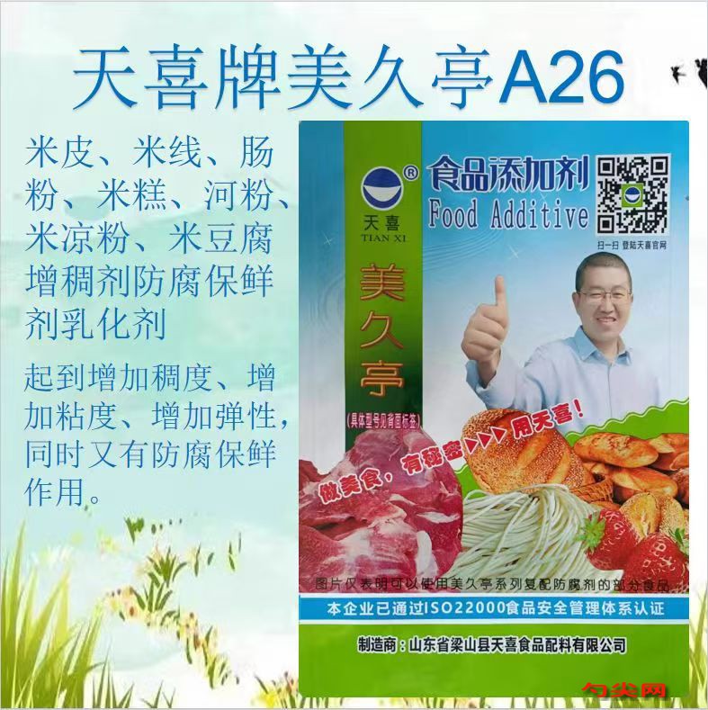 ★功能作用:〔美久亭A26型〕用于纯大米制作的汽蒸米线、自熟米线、手工米线、酸浆米线等各种米线以及米饭、米凉粉、米皮、肠粉、米糕、河粉、大米锅巴、米饭团、米豆腐、米粉条、米花糖、蒸肉米粉、米糊、寿司、发糕、竹筒饼等纯大米制品,起到增加稠度、增加粘度、增加弹性,同时又有防腐保鲜作用。