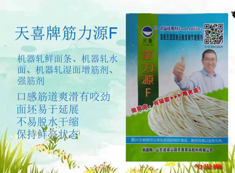 ★温馨提示:1.本品含食用纯碱(碳酸钠),生鲜湿面存放3个小时以上就会变色,可以添加0.06%富马酸(护色剂)进行解决。2.本品不含防腐剂,没有防腐保鲜作用,生鲜湿面保鲜可以添加0.2%美久亭F,同时采用食用酒精喷雾杀菌消毒。生鲜湿面必须放冷柜8-15℃保鲜存放。3.本品不适用于手工生湿面制品,手工生湿面制品可以使用筋力源M型和筋力源H型。4.生湿面制品(食品分类号:06.03.02.01)不包括采用杂粮(比如:玉米面、荞麦面等)面粉制作的面条、豆萁等杂粮制品,生产加工杂粮制品(食品分类号:06.04.02)可以使用筋力源W型。5.加工生产黄色生湿面制品可以添加0.1%七彩滴牌栀子黄,直接加入和面水中即可。6.夏天和好的面团容易发酵,因此弛面时必须放在低温10-15℃冷柜中。6.本品与筋力源H(耐煮时间长)或佳多美L(口感软弹)配合使用效果更佳。