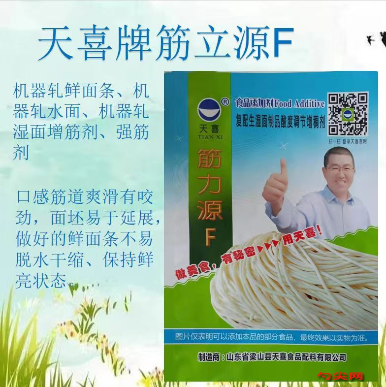 ★温馨提示:1.本品含食用纯碱(碳酸钠),生鲜湿面存放3个小时以上就会变色,可以添加0.06%富马酸(护色剂)进行解决。2.本品不含防腐剂,没有防腐保鲜作用,生鲜湿面保鲜可以添加0.2%美久亭F,同时采用食用酒精喷雾杀菌消毒。生鲜湿面必须放冷柜8-15℃保鲜存放。3.本品不适用于手工生湿面制品,手工生湿面制品可以使用筋力源M型和筋力源H型。4.生湿面制品(食品分类号:06.03.02.01)不包括采用杂粮(比如:玉米面、荞麦面等)面粉制作的面条、豆萁等杂粮制品,生产加工杂粮制品(食品分类号:06.04.02)可以使用筋力源W型。5.加工生产黄色生湿面制品可以添加0.2-0.3%七彩滴1号,直接加入和面水中即可。6.夏天和好的面团容易发酵,因此弛面时必须放在低温10-15℃冷柜中。6.本品与筋力源H(耐煮时间长)或佳多美L(口感软弹)配合使用效果更佳。