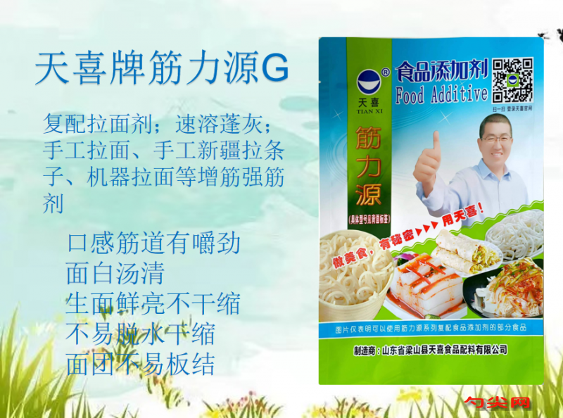 ★功能作用:采用本品加工制作的手工拉面、抻面、新疆拉条子等拉面类生湿面制品口感筋道有嚼劲,面白汤清,生面鲜亮不干缩。和好的面团不易板结、易于拉制面条,拉制好的面条不易脱水干缩。本品为传统烧制蓬灰优良替代品,砷铅不会超标,安全合法。