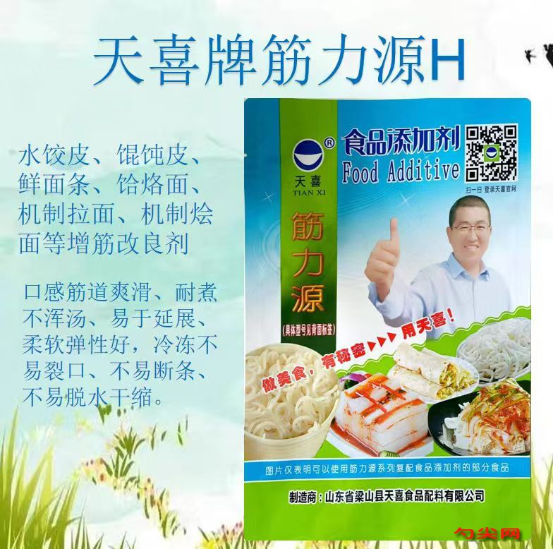 ★功能作用:[筋力源H型]制作的馄饨皮、水饺皮、手擀面、鲜面条、烩面、饸烙面、刀削面等生湿面制品、方便米面制品、冷冻米面制品口感筋道爽滑、耐煮不浑汤、易于延展、柔软弹性好,冷冻不易裂口、不易断条、不易脱水干缩。用于死面灌汤包、水晶蒸包、水晶蒸饺等生湿面制品筋道爽口、弹性好、不裂口。[筋力源H型]还可用于凉面、机器轧制鲜面条、蒸饺、沙茶面、手工大馅水饺、机轧馄饨皮、机轧鲜面条、机轧水饺皮、鱼肉水饺、豆腐渣水饺、水晶死面小笼包、烧麦、水晶蒸饺等。