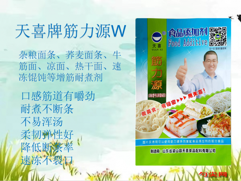 ★商品名:天喜牌筋力源W型 产品名称:筋力源牌复配增稠剂6 型号:JLY-W 本品按照《食品安全国家标准 食品添加剂使用标准GB2760》及补充规定的品种、应用分类、使用范围、最大使用量、残留量等科学组方,并且按照《食品安全国家标准 复配食品添加剂通则GB26687》精心配制而成。本品已经通过食品生产许可,保障食品安全。用户按照本说明的用法用量生产制作的各类食品(配料表中成分在GB2760表A.1中有限量要求的食品除外;配料表中成分在GB2760表A.3中所例外的食品除外)。既不会超标也不会超量。★配料表:聚丙烯酸钠、碳酸钠、碳酸钾、单、双甘油脂肪酸脂、黄原胶、魔芋粉。