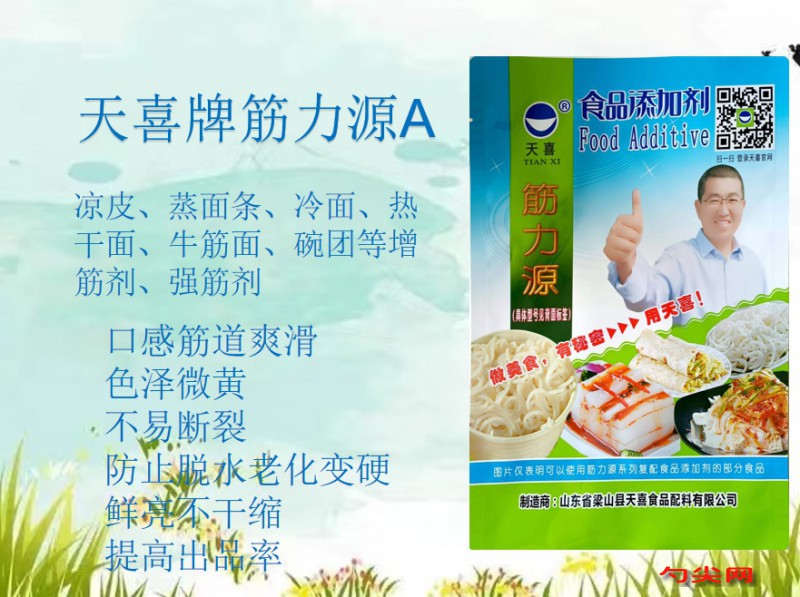 ★温馨提示:1.本品含有食用碱(碳酸钠),按照技术资料操作,凉皮会有轻微发黄现象。如果当地凉皮要求是白色,可以选用筋力源B型(采用本品制作凉皮相对是白色的,但是达不到“非法添加剂”的白色效果)。2.本品不适用于直接用淀粉加工制作凉皮(实际为粉皮或拉皮,可以使用筋力源T型或筋力源Q型)。3.采用淀粉和面粉混合制作凉皮时(免洗面筋法),可以使用筋力源D型或筋力源C型。4.凉皮、酿皮、熟制面皮、蒸面条、牛筋面、热干面、烤冷面、面筋串、碗团等方便湿面制品保鲜可以添加0.2%复配防腐剂美久亭G。5.加工生产亮黄色的凉皮、蒸面条、牛筋面、冷面、凉面、热干面、方便炸酱面、方便面、干吃面、油炸伊面等方便米面制品可以添加0.15%七彩滴1号,直接加入和面水中即可。